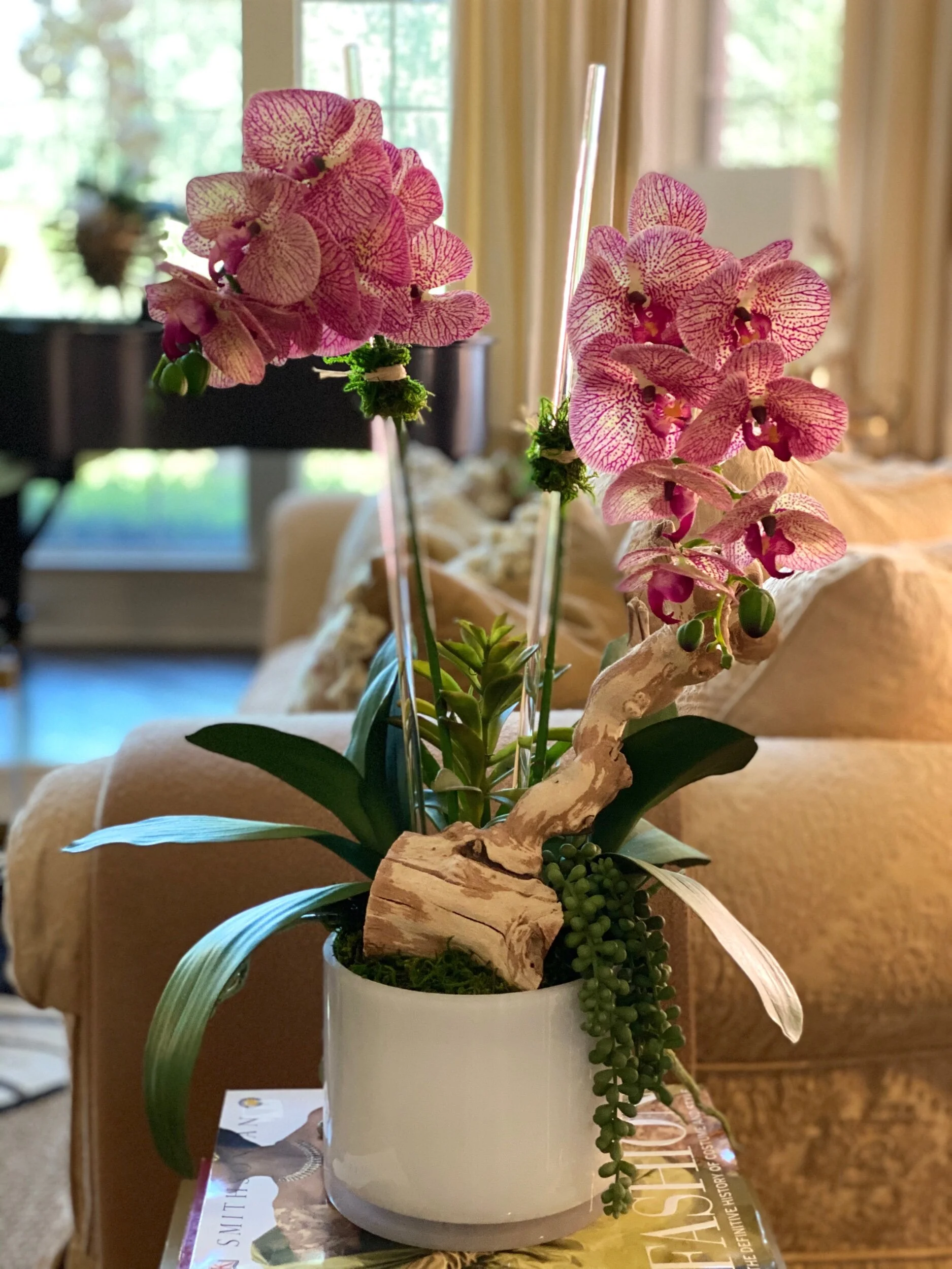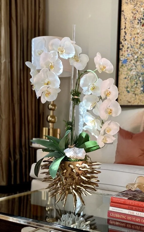 While the beauty of the florals fade quickly as they bloom and then die off, Iâve figured out a way to have âfaux-everâ florals all year long. Now before you say anything, artificial flowers have come a long way from the plastic, often tacky look in days past. Gone are those cringeworthy arrangements you see collecting dust and cobwebs that look like theyâre overflowing from their vases/pots. Iâm quite impressed with how real, both visually and texturally, they are up close and to the touch. I even have people coming up and touching my orchids just to see. If they were real, theyâd surely die with all the traffic from onlookers.